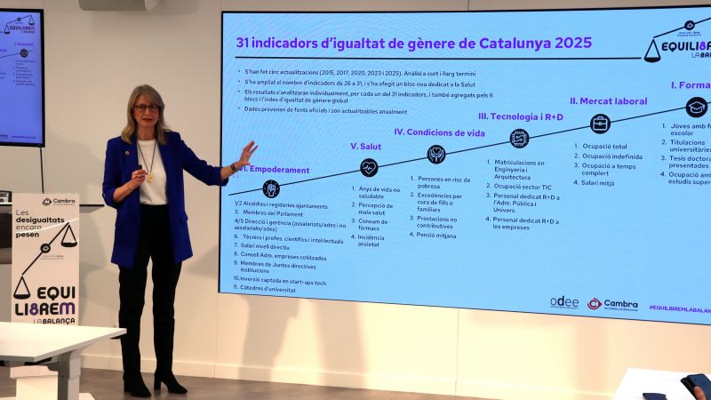 L'informe presentat per l'Observatori, Dona, Empresa i Economia (ODEE) de la Cambra de Comerç de Barcelona mostra com les desigualtats de gènere es mantenen "igual d'elevades" en el sector de les TIC i de la Salut, i que s'avança lentament en el mercat laboral. L'estudi Indicadors d'igualtat de gènere de Catalunya 2025 s'ha presentat aquest divendres, dies abans del 8M, per destacar que la igualtat avança a "diferents velocitats" i la bretxa salarial continua sent "important", encara que les dones tenen un nivell formatiu "superior". Carme Poveda, directora de l'observatori, ha destacat que els resultats permeten tenir una "visió de llarg termini de l'evolució" i que demostren que el sostre de vidre "es desplaça cap amunt, però no es trenca".