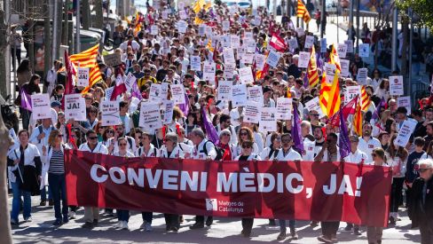 Al menos medio millar de personas se han concentrado este viernes por la mañana en el Hospital del Mar para manifestarse en la novena jornada de huelga convocada por el sindicato Metges de Catalunya desde octubre —la segunda esta semana—, en una protesta que tiene previsto llegar al Parlament y confluir con la movilización de los docentes. Los manifestantes han empezado a caminar hacia las once y media. En la cabecera, el mensaje de la pancarta clama '¡Convenio médico, ya!'. Los médicos piden "diálogo real" con los responsables políticos y "medidas estructurales" ante la sobrecarga laboral. El sindicato lamenta que el Departamento de Salud les sigue "ignorando".